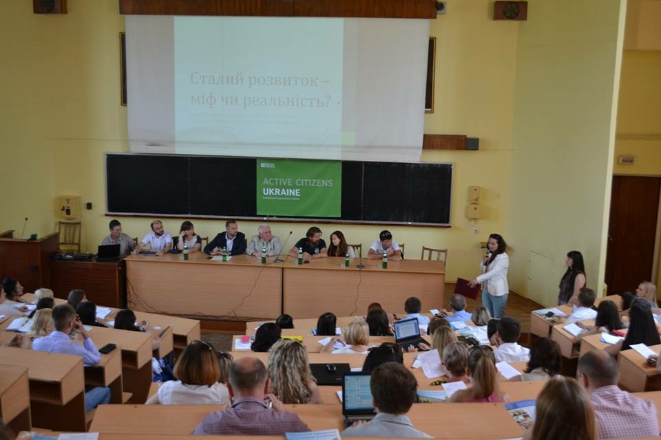 Менеджер програми «Активні громадяни» в Україні Тихонович В. поділився своїм улюбленим терміном сталого розвитку: «Це те, що ми залишимо дітям». Навівши переконливі приклади, експерт наголосив на стовідсотковій реальності сталого розвитку в Україні.